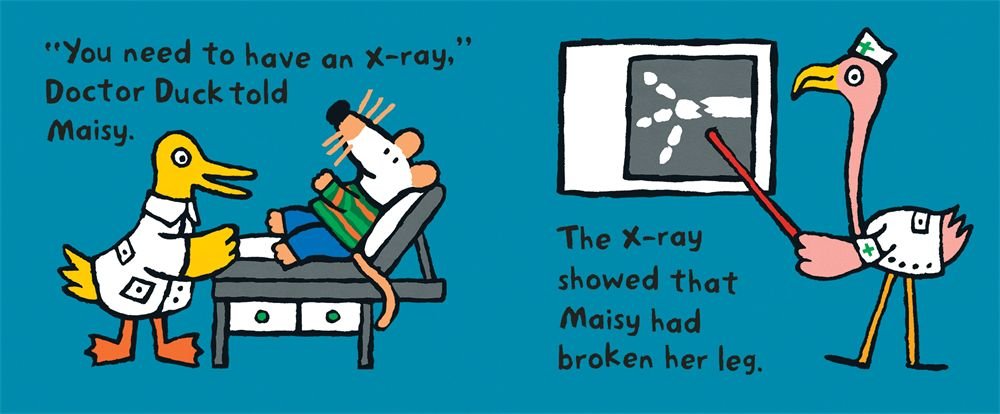 Maisy has broken her leg playing on the trampoline, and now she's in hospital for the night. At first it's a bit scary being all on her own, but she soon makes friends with Dotty in the next bed and when Cyril and Tallulah visit the next day, Maisy begins to feel much better.