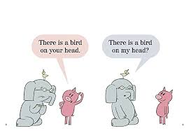 Gerald and Piggie are best friends. In There's a Bird on Your Head!, Gerald discovers that there is something worse than a bird on your head - two birds on your head!